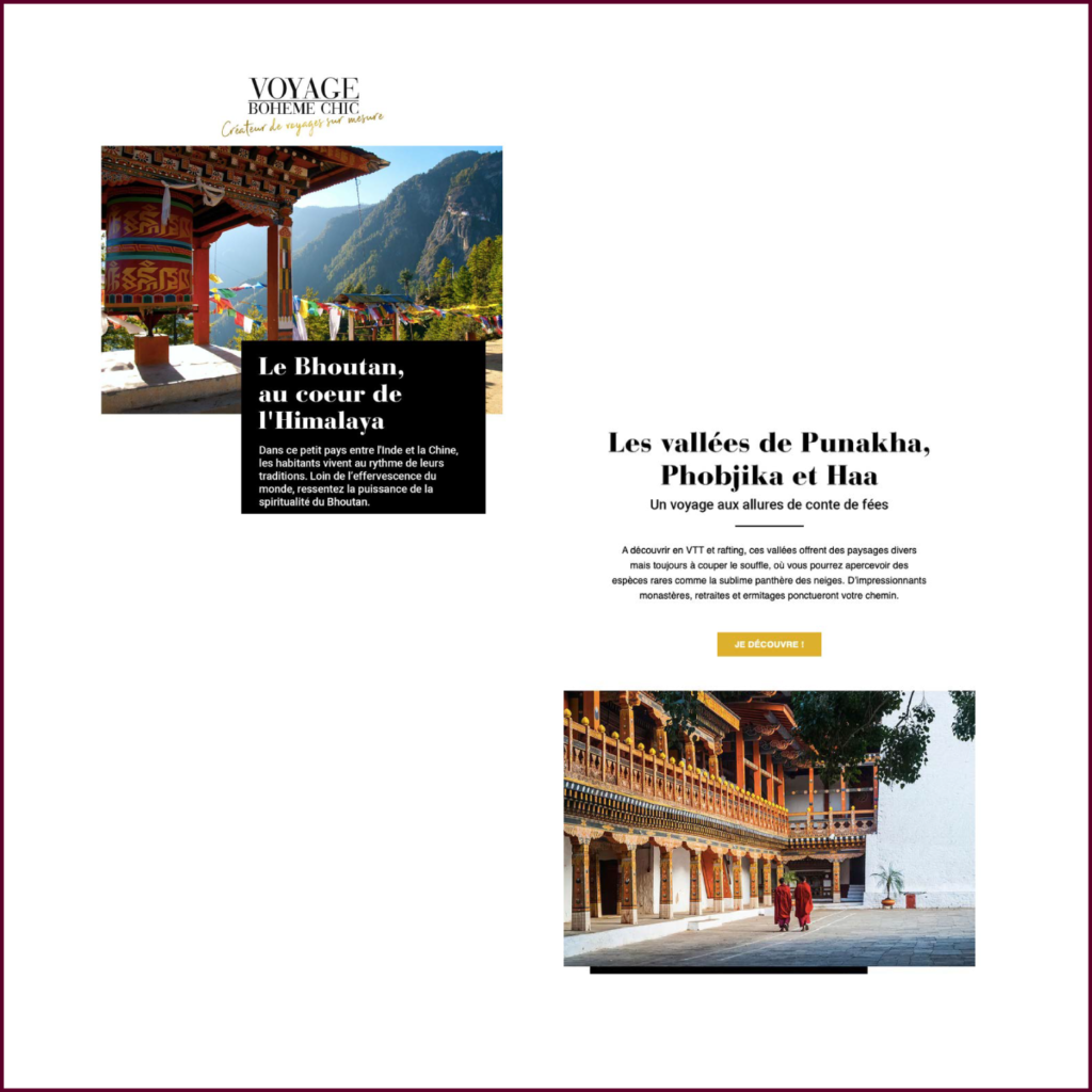Le brief L’agence de voyage Voyage Bohème Chic souhaitait faire découvrir des destinations insolites à leur cible, ici le Bhoutan.